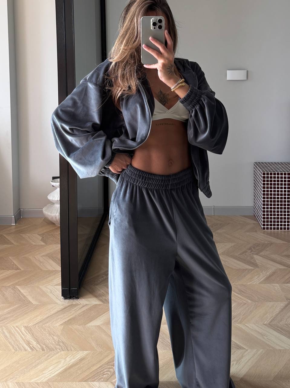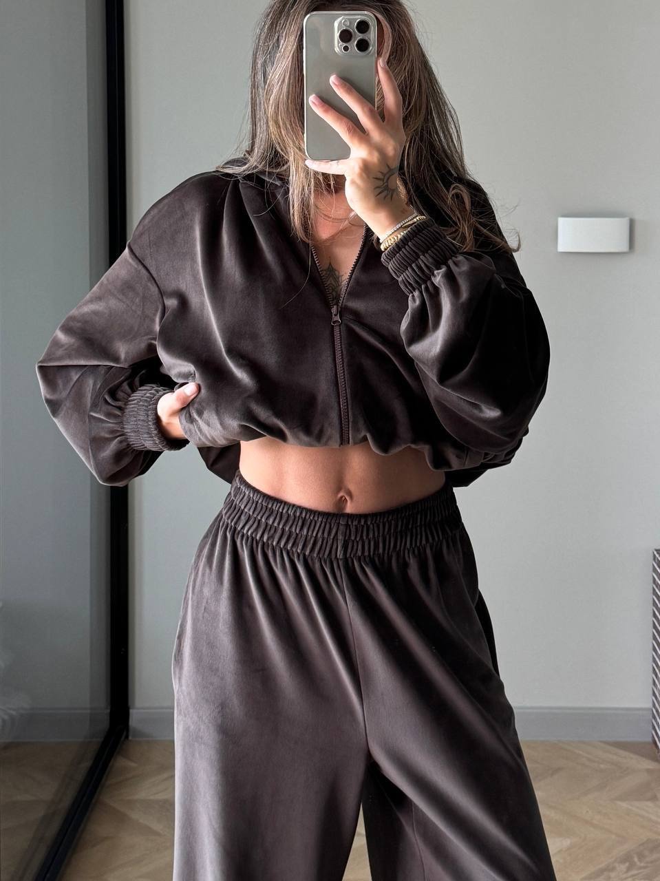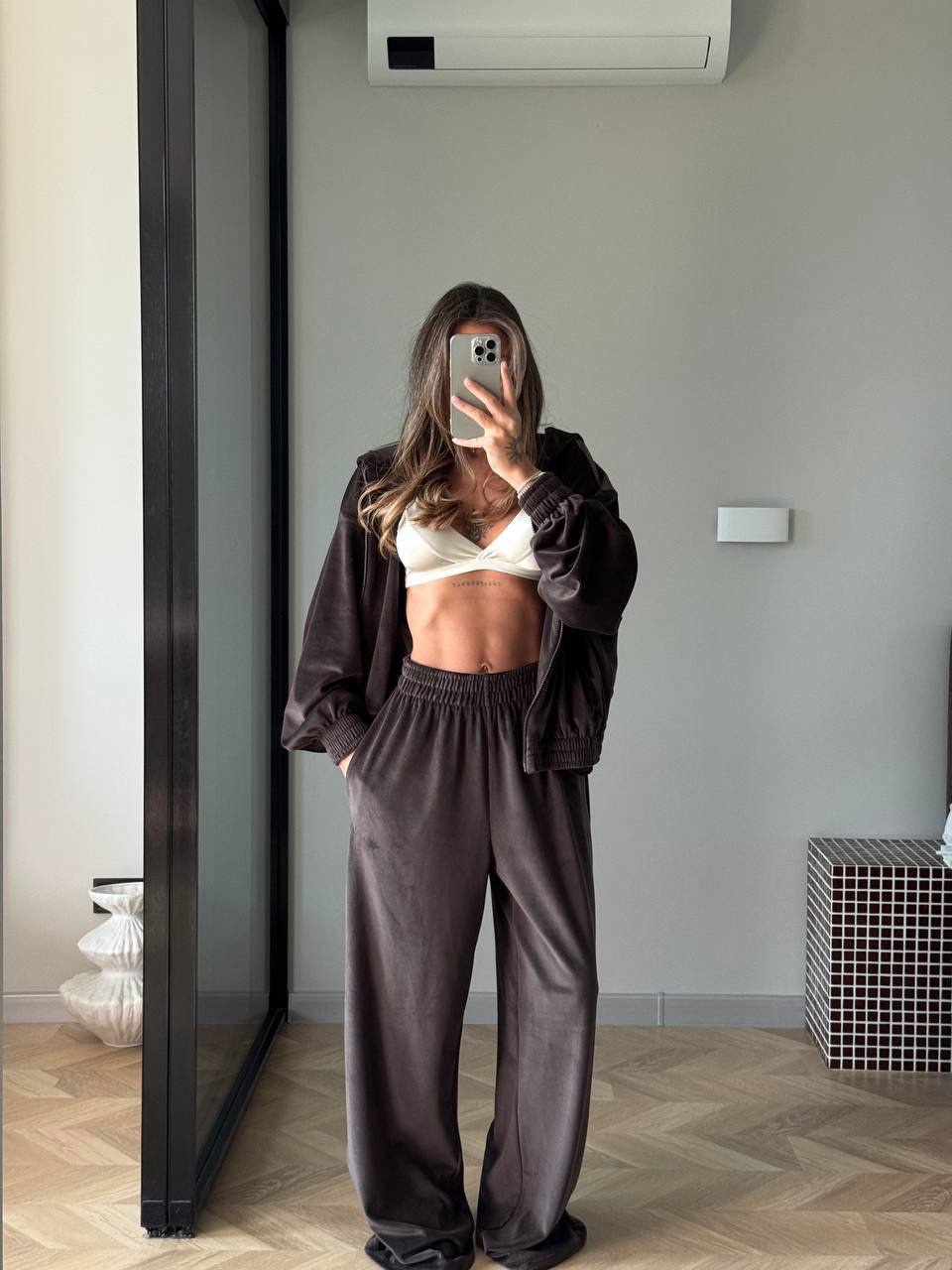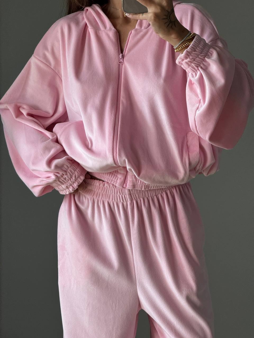 Доставимо новою поштоюOversize велюровий костюм зі штанами палаццо та кофтою на блискавці з капюшоном для затишку й стилю.