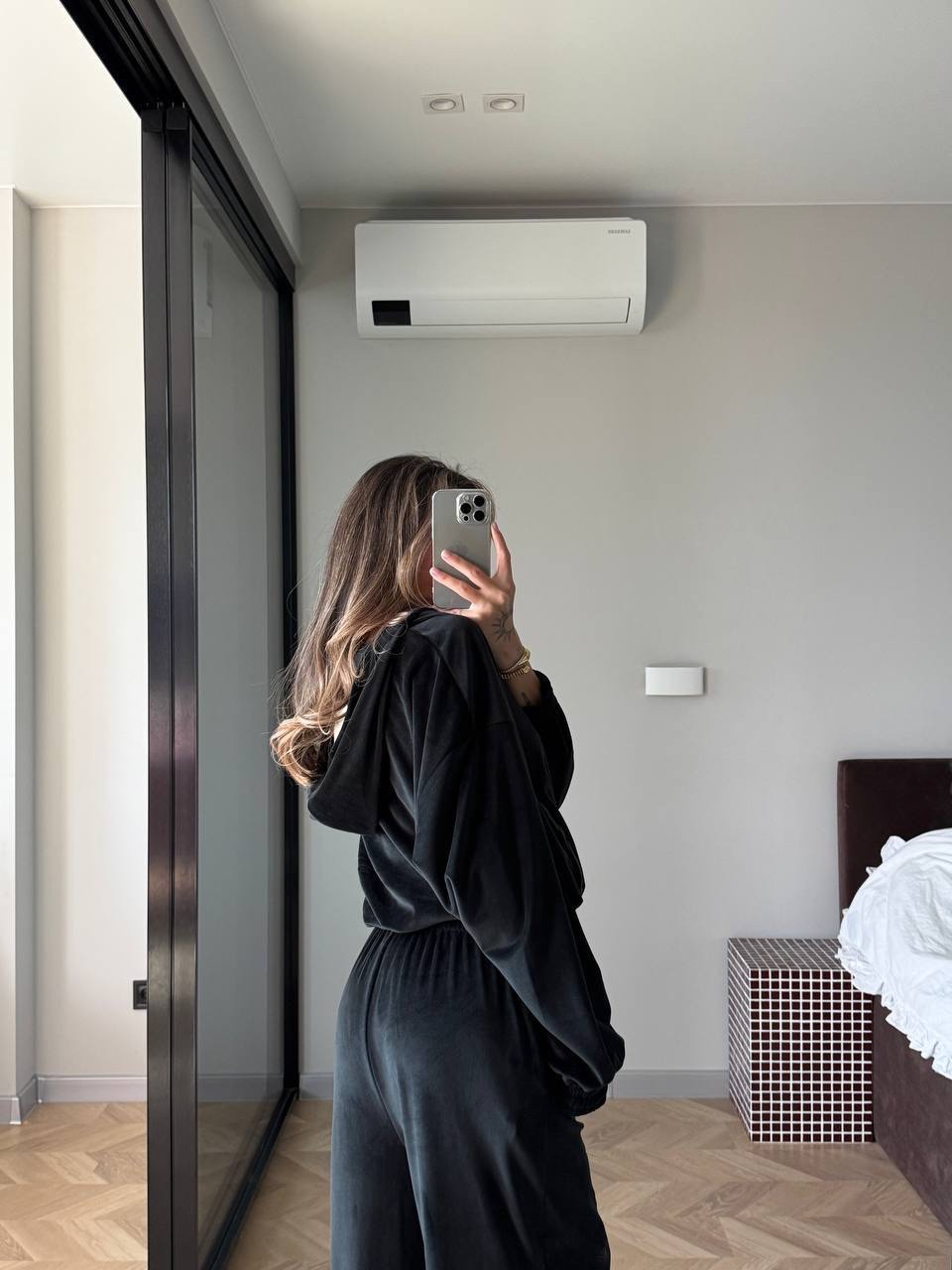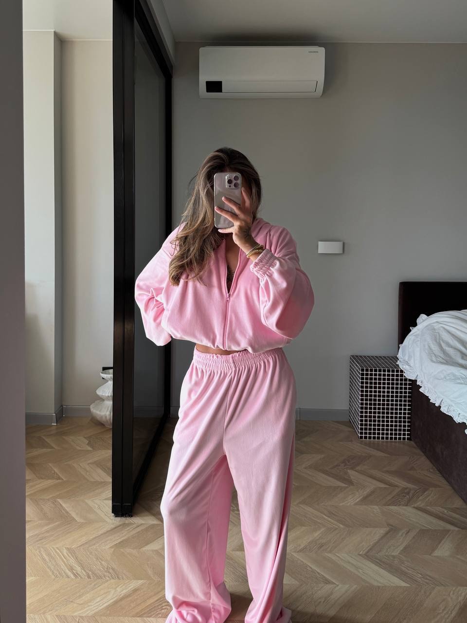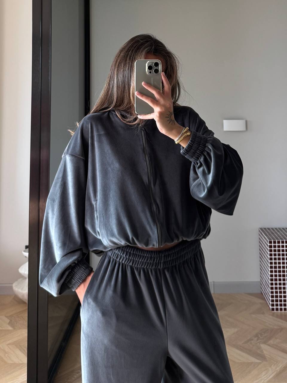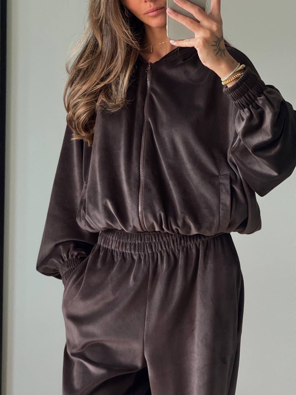 Доставимо новою поштоюOversize велюровий костюм зі штанами палаццо та кофтою на блискавці з капюшоном для затишку й стилю.