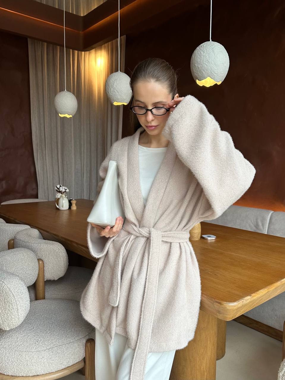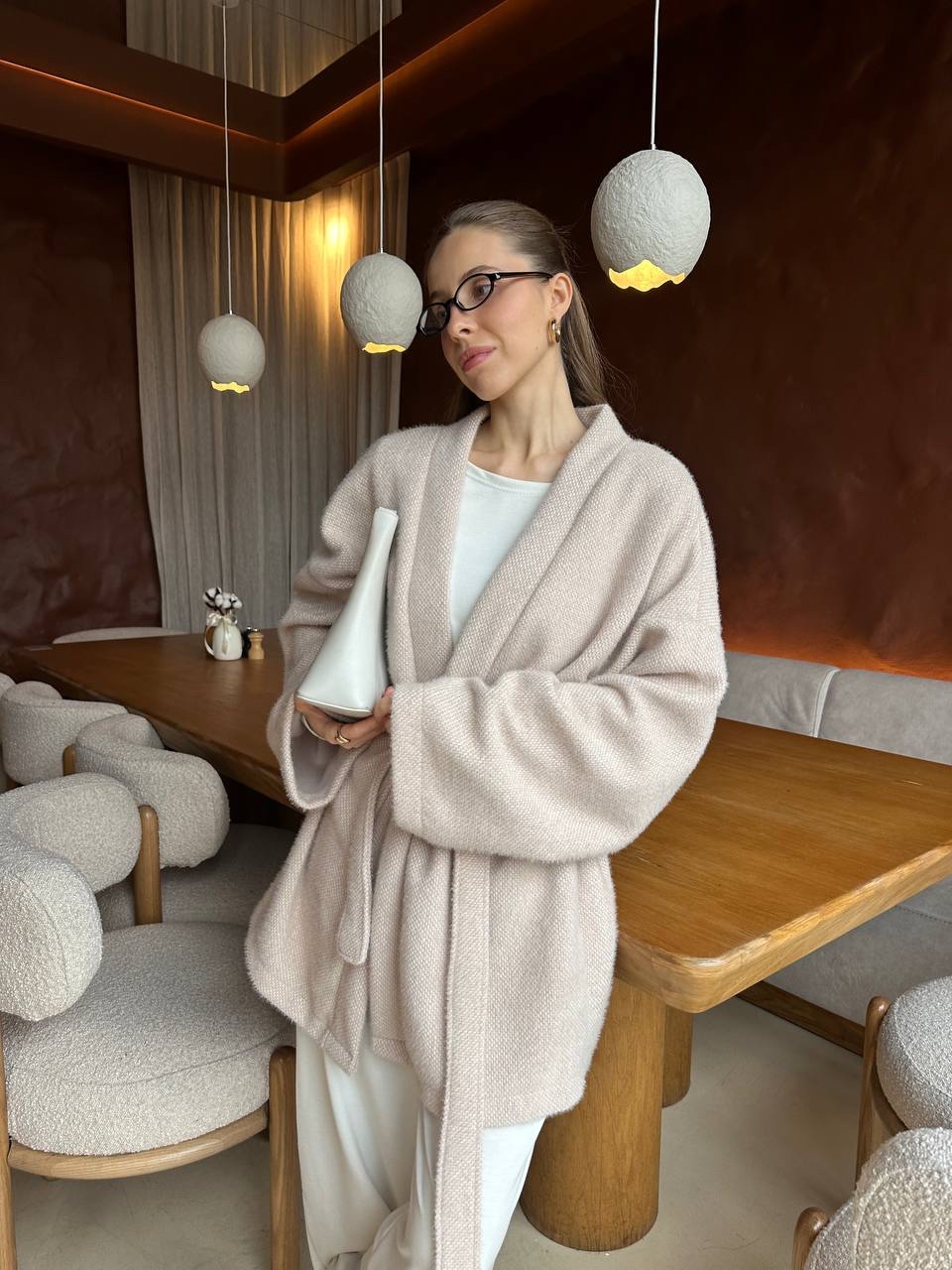 Кардиган «Monna» — це втілення ніжності й затишку, яке огортає теплом у прохолодні дні. Модель виконана з пухнастої пальтової ангори, що має приємну ворсисту текстуру та легкий блиск. Вільний крій дарує свободу рухів, а поясок на талії дозволяє підкреслити силует або носити у розслабленому стилі. Широкі рукави додають образу легкості та сучасного шарму. Ідеально поєднується як із джинсами та футболкою, так і з жіночними сукнями, створюючи багатошарові, стильні луки.