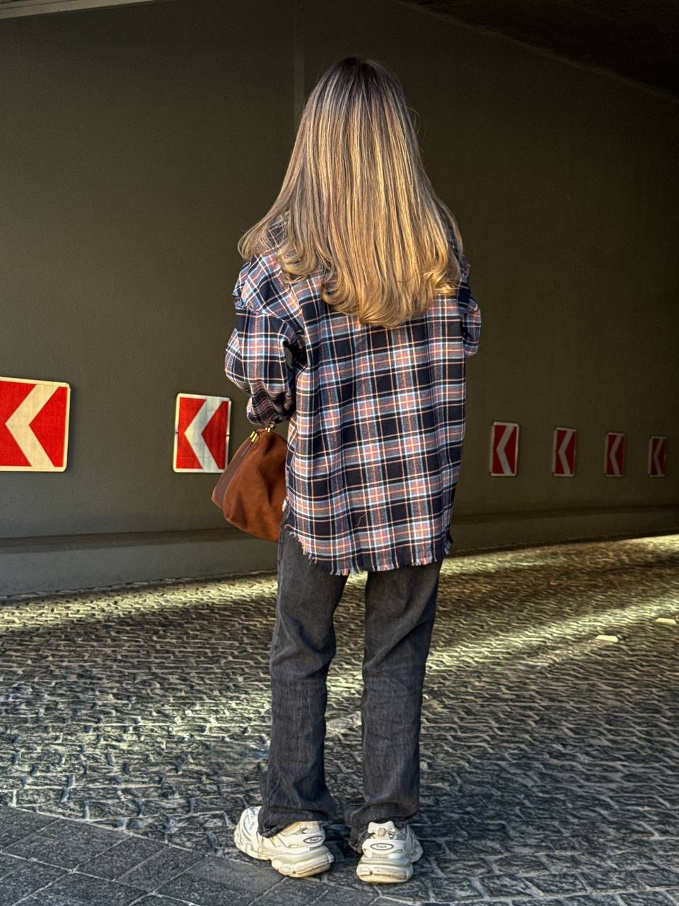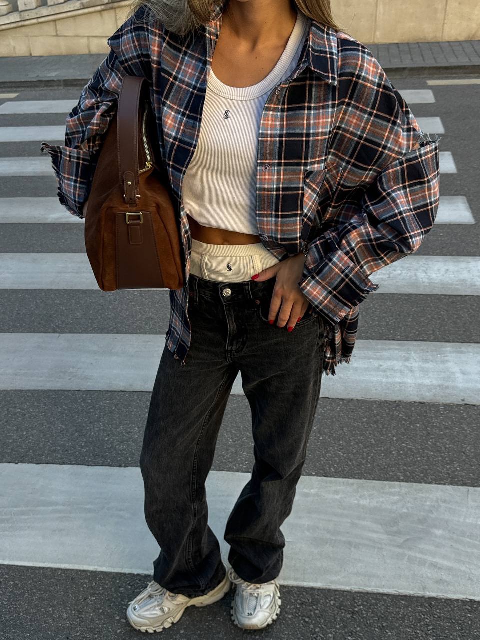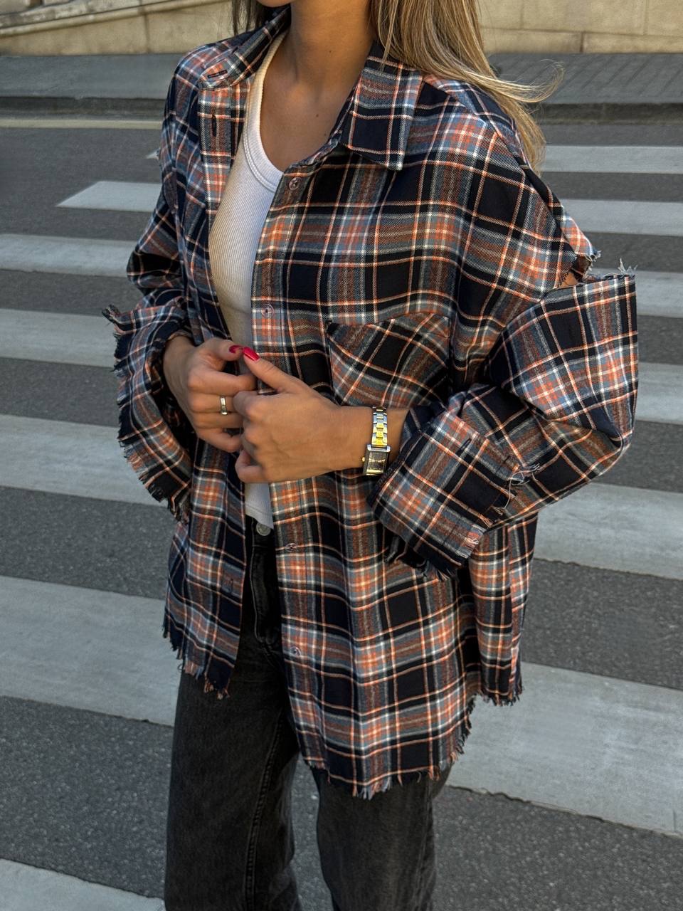 Сорочка в клітинку oversize з фланелі — тренд цього сезону, що поєднує комфорт та стиль. Імітація відірваних рукавів додає особливого характеру, а необроблений низ і манжети створюють ефект легкої недбалості. Ідеально підходить для повсякденних образів у стилі streetwear або casual.