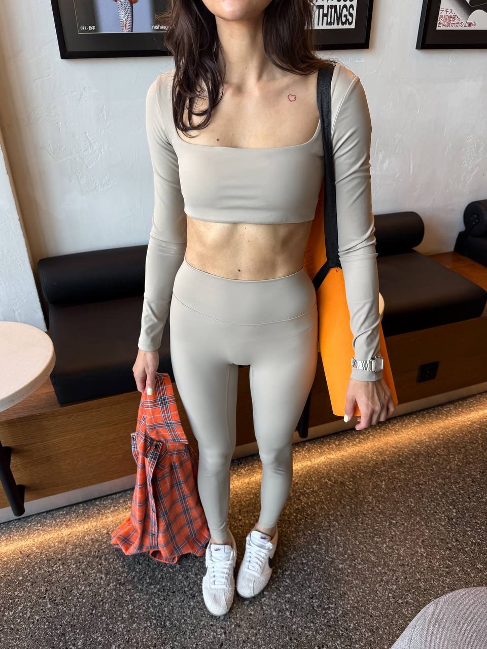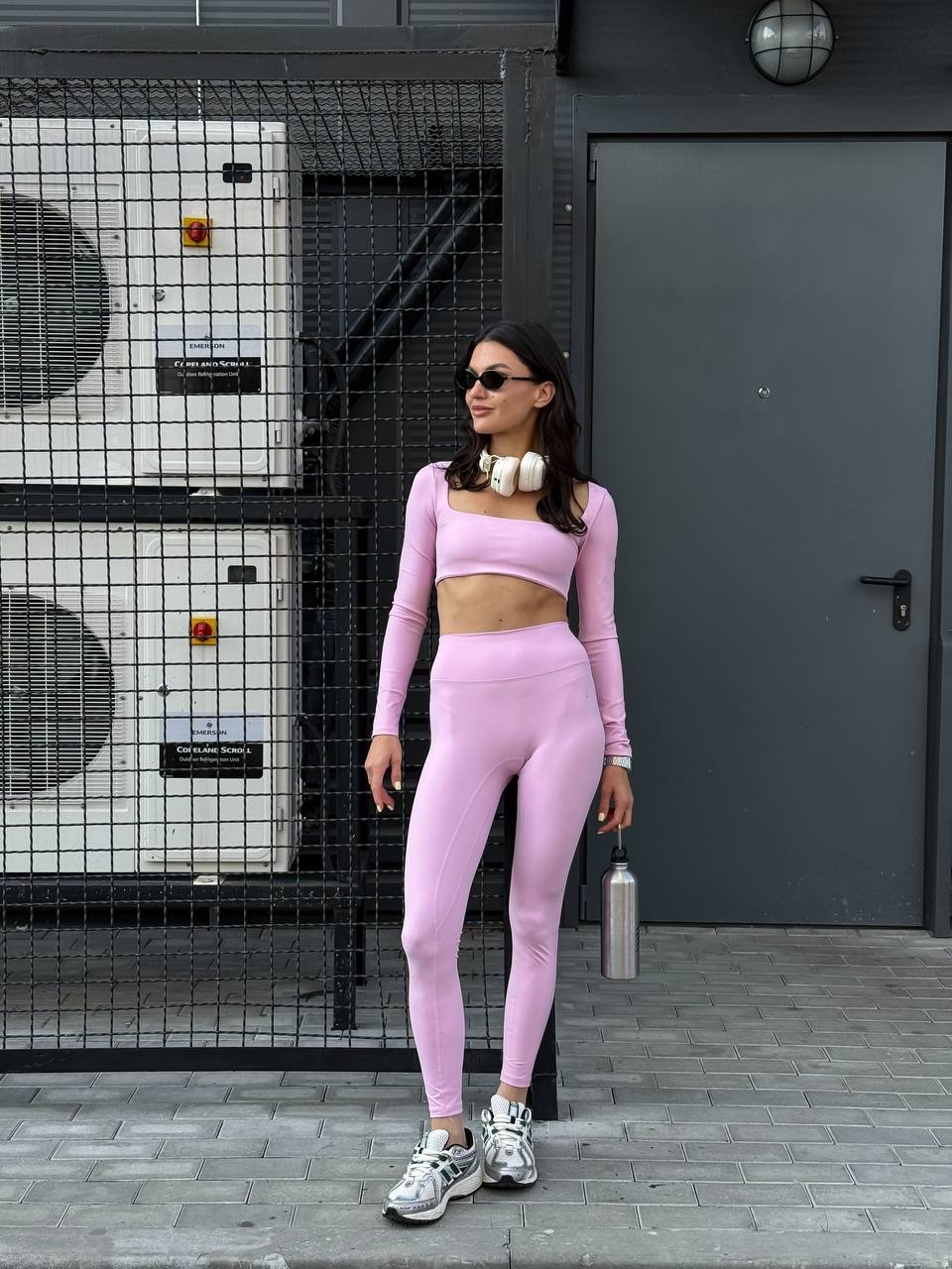 Легінси з високою посадкою підкреслюють фігуру та створюють стрункий силует, а топ-рашгард із довгим рукавом забезпечує зручність і свободу рухів.