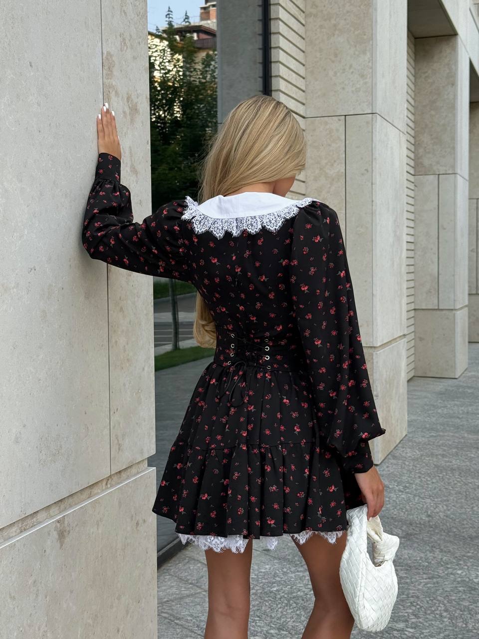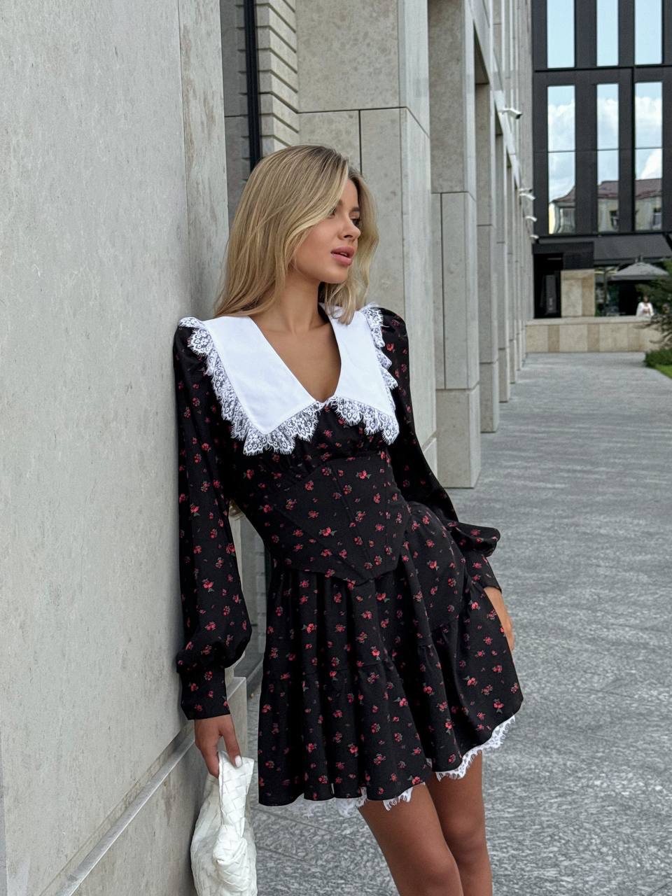 Сукня з софту чорна у квіти з білим мереживним коміром та корсетом. Легка, жіночна й стильна.
