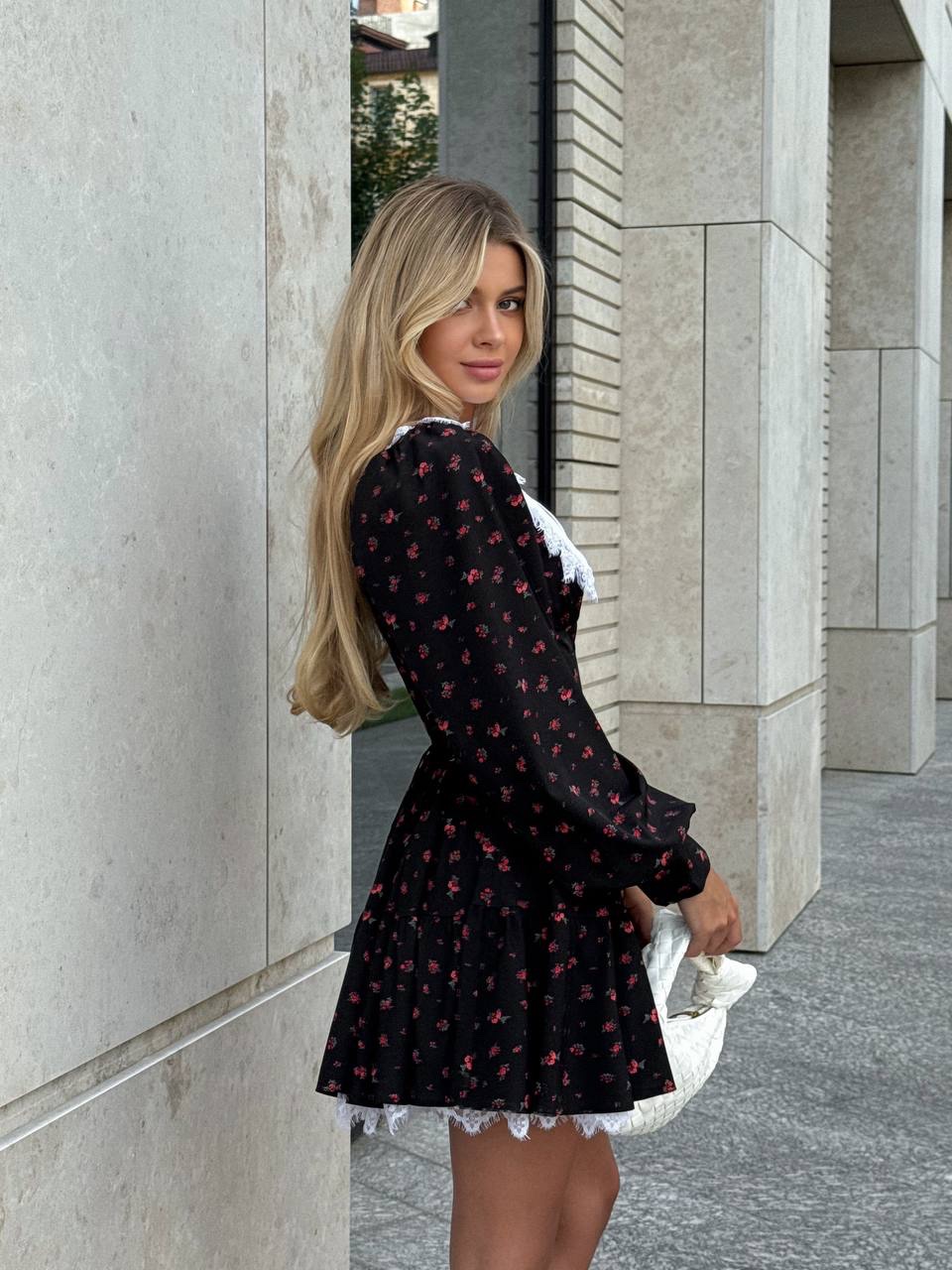 Романтична сукня з софту у чорному кольорі з дрібним квітковим принтом – вибір для тих, хто цінує ніжність і жіночність. Акцентом моделі є білий комір з мереживною обробкою та мереживо по низу виробу, що додає образу вишуканості. Завдяки корсету зі шнурівкою на спинці можна підкреслити талію та створити ідеальну посадку. Легкі рукави на манжетах створюють ніжний об’єм, а довжина міні додає грайливості.