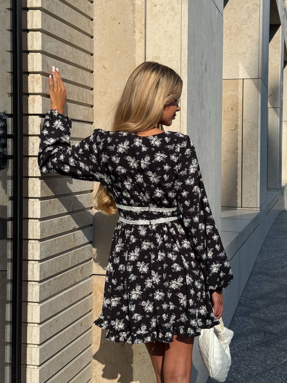 Стильна міні-сукня з софту у чорному кольорі з білим квітковим принтом.