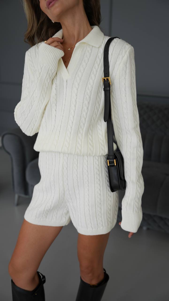 Джемпер з V-подібним вирізом і довгими рукавами у поєднанні з вільними шортами створюють легкий, але водночас елегантний образ. Фактурний візерунок «коси» додає ніжності, а м’який трикотаж дарує комфорт кожного дня.