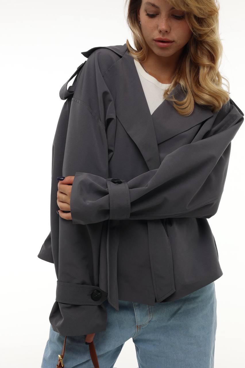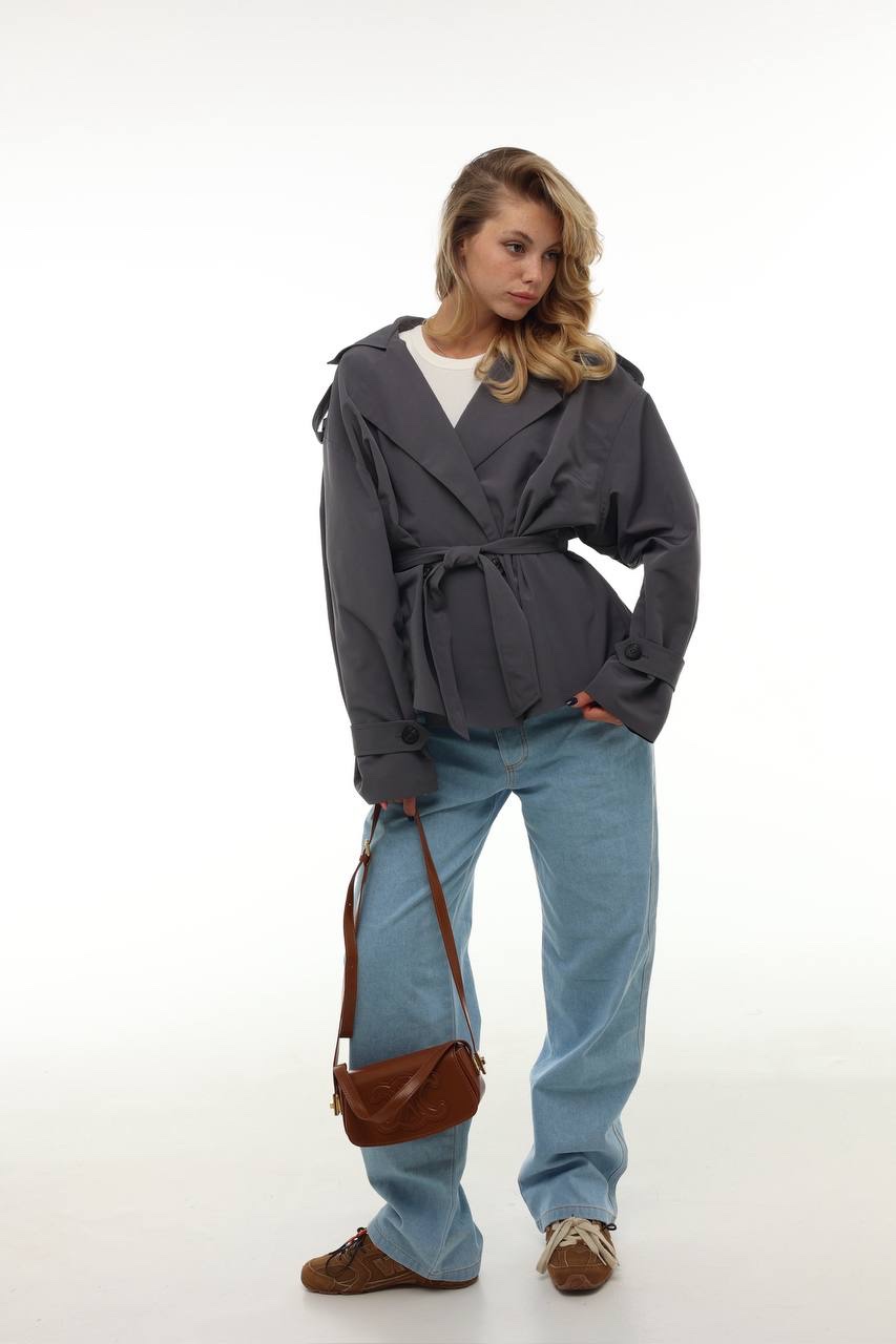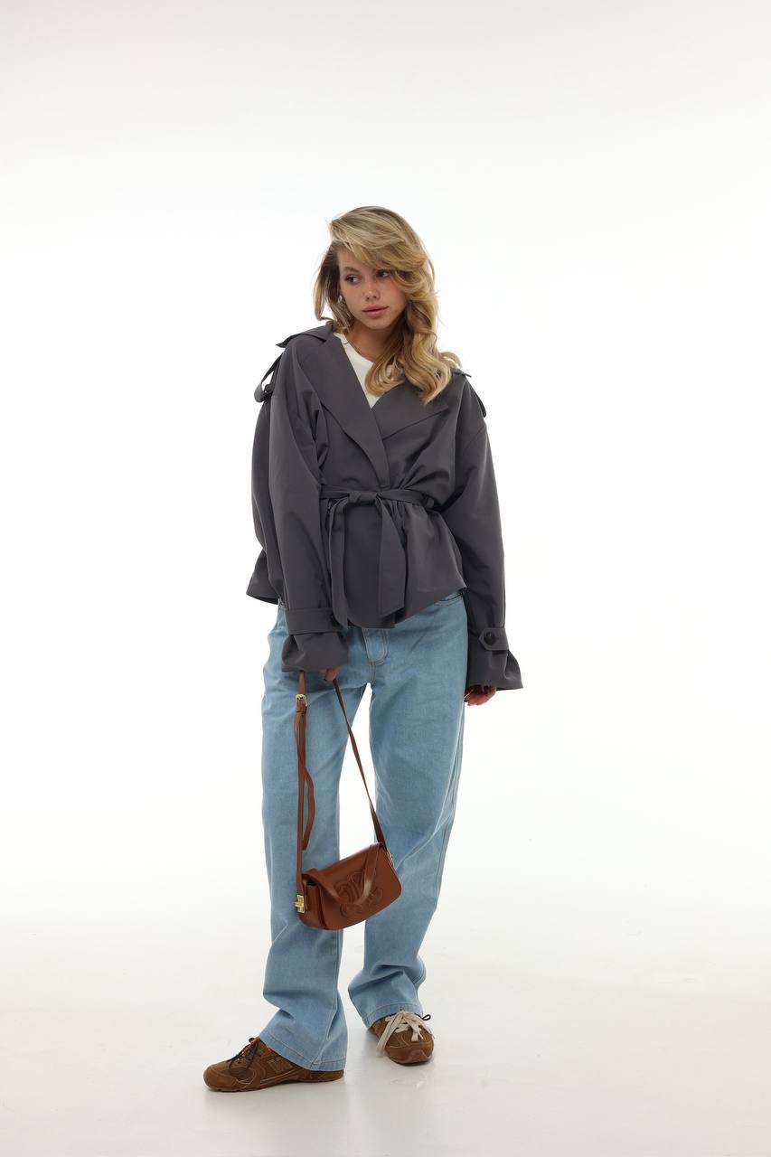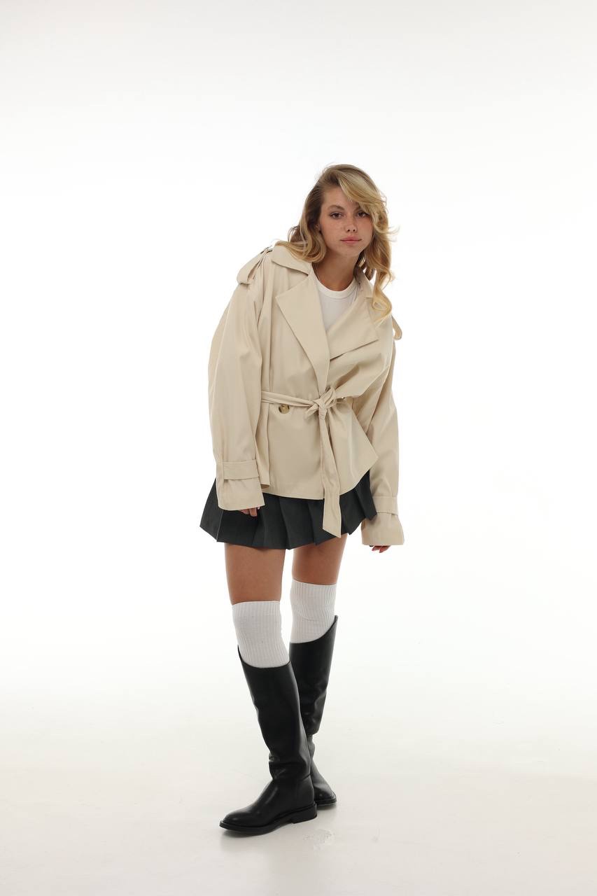 Стильний укорочений тренч із акцентним поясом на талії, який ідеально підкреслює силует. Широкі відкладні лацкани додають класики, а застібка на ґудзики та зручні кишені роблять його практичним для щоденного використання. Рукави доповнені ремінцями з ґудзиками, що дозволяють регулювати об’єм і створювати різні варіанти посадки. Легка oversize-форма забезпечує трендовий вигляд і комфорт, а універсальний крій гармонійно поєднується як з класичними луками, так і з кежуал-образами.